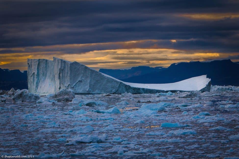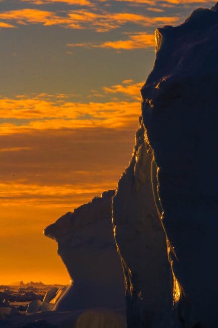 We’ve been lucky enough to visit both Antarctica and The Arctic. We can honestly say that the icebergs and fjords of Greenland took our breath away even more than Antarctica. And that is saying a lot. Maybe it is because the polar ice caps of the North are melting so fast, but the icebergs of Greenland were massive and filled with layers of colour. Each morning we ran out on deck of our ship The Sea Spirit to watch the sunrise over the fields of ice surrounding us.