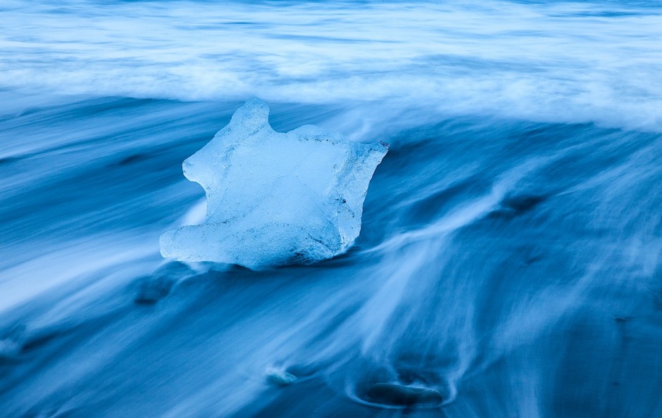 A melting iceberg on the black volcanic sand beach at Jökulsárlón